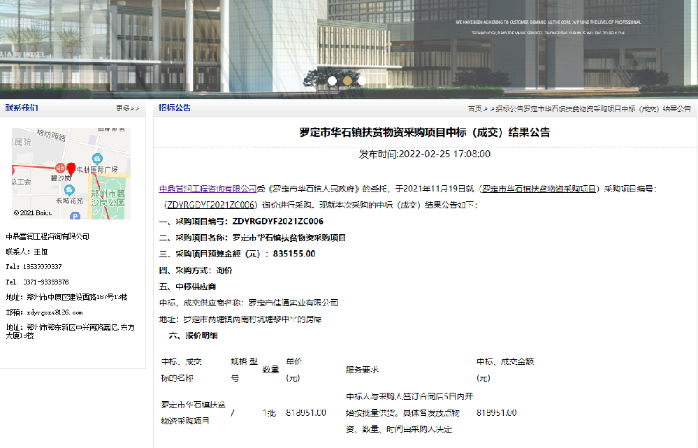 鼎點娛樂工程咨詢有限公司受《羅定市華石鎮(zhèn)人民政府》的委托,于2021年11月19日就(羅定市華石鎮(zhèn)扶貧物資采購項目)采購項目編號:(ZDYRGDYF2021ZC006)詢價進行采購。現(xiàn)就本次采購的中標(成交)結果公告如下:一、采購項目編號:ZDYRGDYF2021ZC006二、采購項目名稱:羅定市華石鎮(zhèn)扶貧物資采購項目三、采購項目預算金額([詳細]